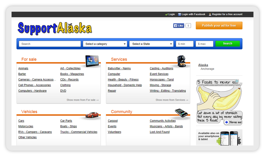 Alaska Based Classifieds Website, Device Responsive, Adsense, Facebook login.